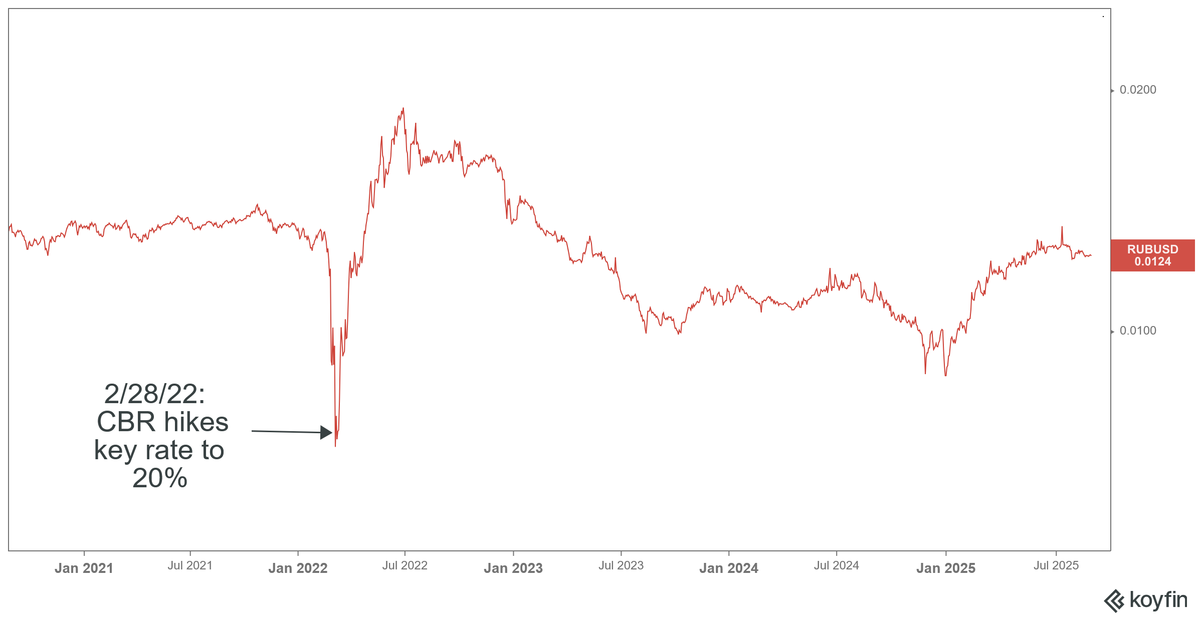 The story of the “Russian Rebound” wouldn’t be possible without the help of Elvira Nabiullina, the governor of the Central Bank of Russia (CBR). Despite attempting to resign in the wake of the Ukrainian Invasion, Nabiullina has been instrumental in limiting the damage inflicted by Western sanctions thanks to overarching capital controls and monetary policy levers. Since the invasion in 2022, Nabiullina and the CBR have made it exceptionally difficult for Russians to purchase foreign currencies4, meanwhile they have forced Russian exporters to convert their foreign currency holdings into rubles. The exchange of rubles for competing currencies creates a bid for the ruble and has helped the country’s exchange rate recover from historic lows seen in February 2022.