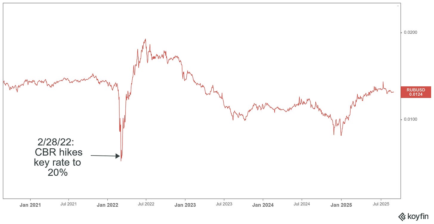 This is not Nabiullina’s first rodeo: Her tenure dates back to 2013, prior to the 2014 Annexation of Crimea, in which she embarked on a similarly aggressive maneuver to triage Russia’s economy amidst the Russian financial crisis of 2014-16. Her activity during this period won her the title of Euromoney’s “Central Banker of the Year” in 2015 as well as Banker Magazine’s “European Central Banker of the Year” in 2017. She is known for conveying her views on the economy or monetary policy by wearing colorful, symbolic brooches during her public appearances. For instance, Nabiullina wore a hawk brooch in March 2021 when the CBR voted to hike interest rates by 25bps, the first time in almost 3 years. She has also worn dove brooches when the CBR has cut rates, snowmen for when rates are “frozen”, in addition to scales, jungle cats, and other inanimate objects.