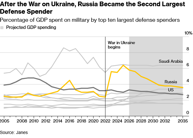 Nevertheless, the attrition on both sides of the conflict is staggering. Over 1.5 million casualties have been recorded since the start of the war, of which +1 million are Russian casualties. The Russian death toll from the Ukrainian Invasion is over fifteen-times the amount of people who perished in Russia’s ten year war with Afghanistan. As a function of this, Russia’s male population has shrunk by an estimated 600,000 people since 2021, exacerbating one of the most severe gender imbalances in the world. Even in this light, the country has explored implementing year-round conscription, versus the biannual process that is employed today. It does not appear that Russian leadership has much urgency for a ceasefire. Perhaps it is because the Russian economy has grown drunk off their war dependency. The country spends over 6% of GDP on defense spending, putting them only behind Saudi Arabia in terms of relative spend. While this allocation has translated into high-paying jobs across logistics and manufacturing, President Vladimir Putin has expressed concern over how this elevated spend might impact Russia’s budget and inflationary pressures. This imbalance can be viewed as a real world example of the crowding out principle, which stipulates that higher government spending can deter private investment. In theory, increased government spend will push up interest rates across the market, making it harder for domestic industries like construction and tourism to access capital. Even oil, after hitting $110/bbl in the summer of 2022, has traded down to levels not seen since 2021.